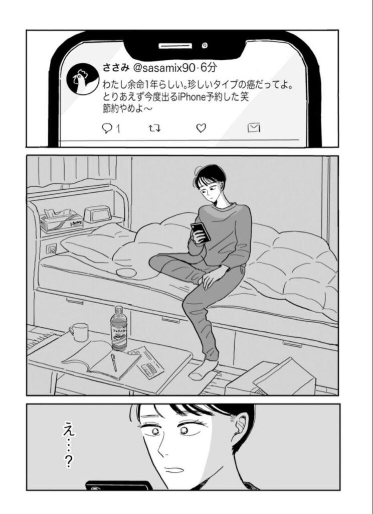 Но однажды постов у Сасаки становится меньше, она больше не ппубликует нейл-арт. И в итоге пишет, что у нее тяжелая стадия рака, жить осталось год. «Ну что ж, закажу новый айфон – смысла откладывать покупку больше нет!» — как бы шутя говорит она о своей болезни.Моримото сомневается, как отреагировать на печальную новость. Это не тот случай, когда лайк может означать поддержку. Героиня решает оставить комментарий, поддержать Сасами. За что получает искреннюю благодарность: Сасами отвечает, что тоже читает твиты Мори и следит за ее жизнью, любит ее посты. Так они начинают больше взаимодействовать и комментить друг друга, иногда к ним присоединяется некий юзер с аватаркой панды, с которым у Сасами, похоже, очень теплые отношения.Один раз Сасами комментит фотку Мори с пейзажем, замечая, что, она узнает место на фото. Похоже, они живут где-то поблизости. Панда предлагает развиртуалиться их твиттер-компашке и Сасами очень этого хочет, но болезнь совсем ее подкашивает.