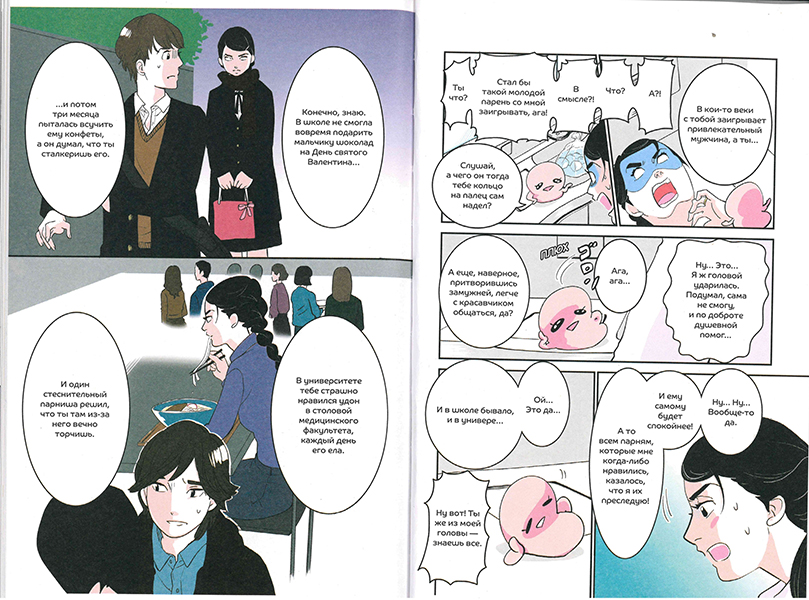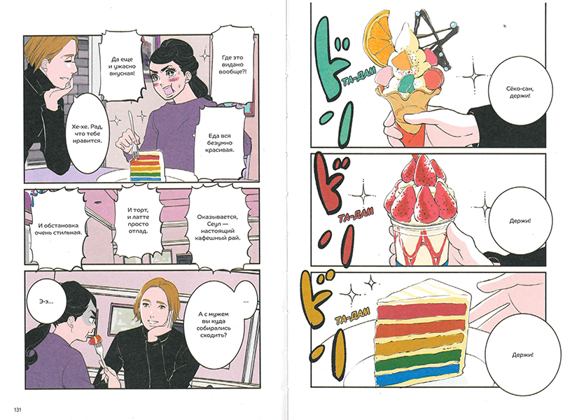 Хотя «Фальшивая измена» – это вебтун, работа больше напоминает просто покрашенную мангу. Потому при чтении томика понимаешь, что первоисточник – это вебтун, пожалуй, только потому, что сама книга небольшая – 143 страницы (стандартный том манги – обычно 200 страниц). Раскадровка не такая «богатая», но все еще скорее больше напоминает классическую сёнэн- или сэйнэн-мангу с большим количеством квадратных фреймов. А продолговатые «полосы», свойственные вебтунам, которые «тянутся» по странице вниз, в работе практически не использованы, поэтому в виде бумажного томика «Фальшивая измена» выглядит очень добротно. Так что, если у вас проблемы с чтением вебтунов, и вы больше любите мангу, можно, наверное, попробовать познакомиться с этим типом комиксов через «Фальшивую измену». Кстати, цвет в вебтуне очень приятный – приглушенный.Хигасимура в послесловии первого тома поделилась тем, как начинала работу над произведением: это был зака от корейской стороны. Что, кстати, неудивительно: мангака известна своей любовью к корейской культуре и KPOP. Кстати, скорее всего, именно поэтому мужские персонажи в «Фальшивой измене» так похожи на корейских айдолов. Манга выходила сначала онлайн – одновременно на корейском языке (в приложении «LINE WEBTOON» и на японском («LINE MANGA»).